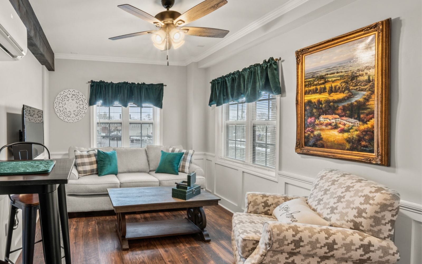 A fully furnished 1-bedroom apartment located on the 1st floor in the heart of town, conveniently situated near train tracks.