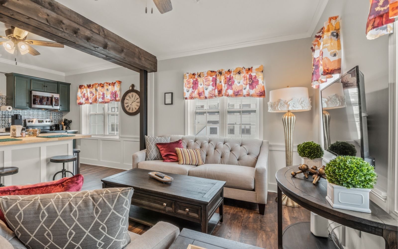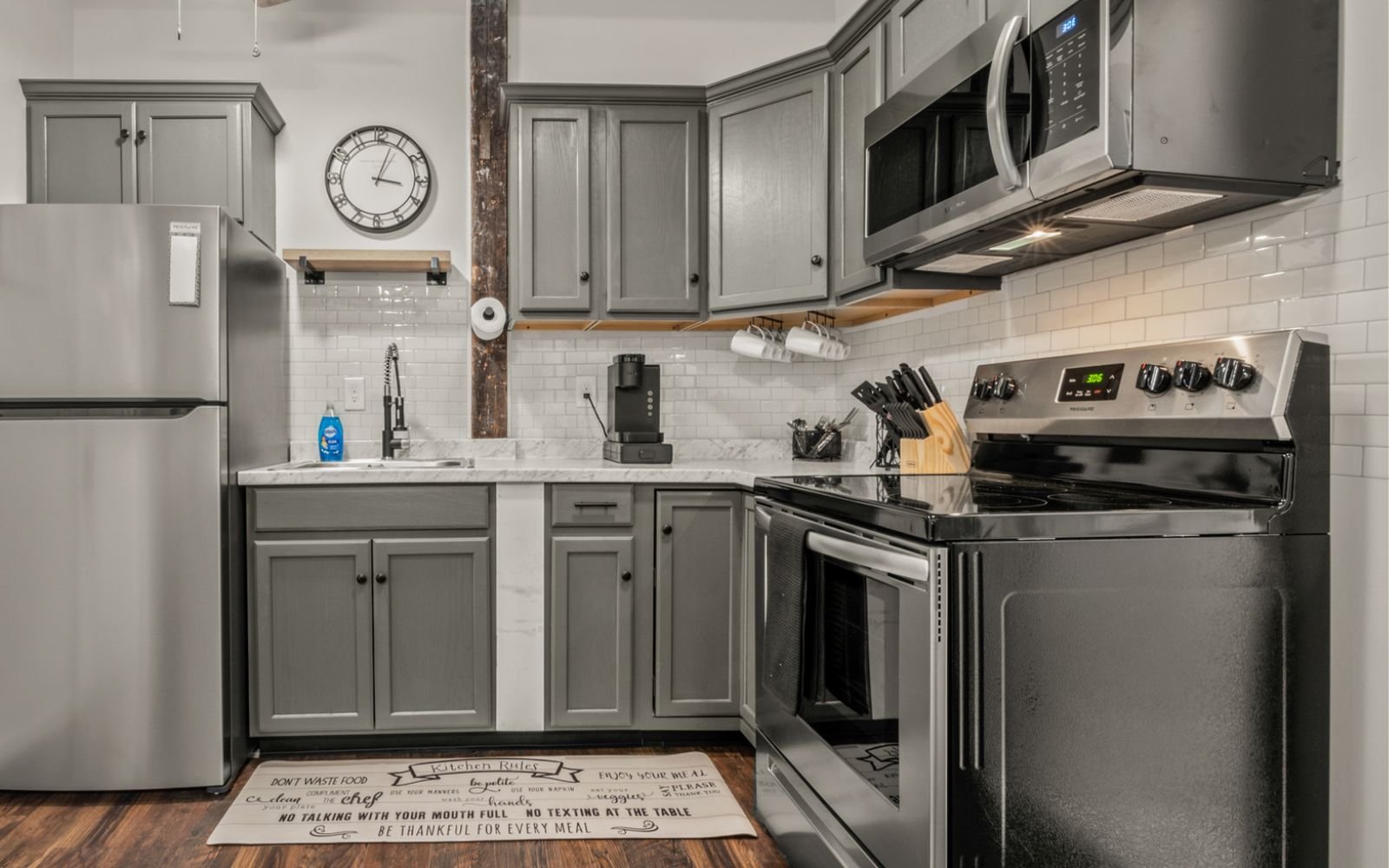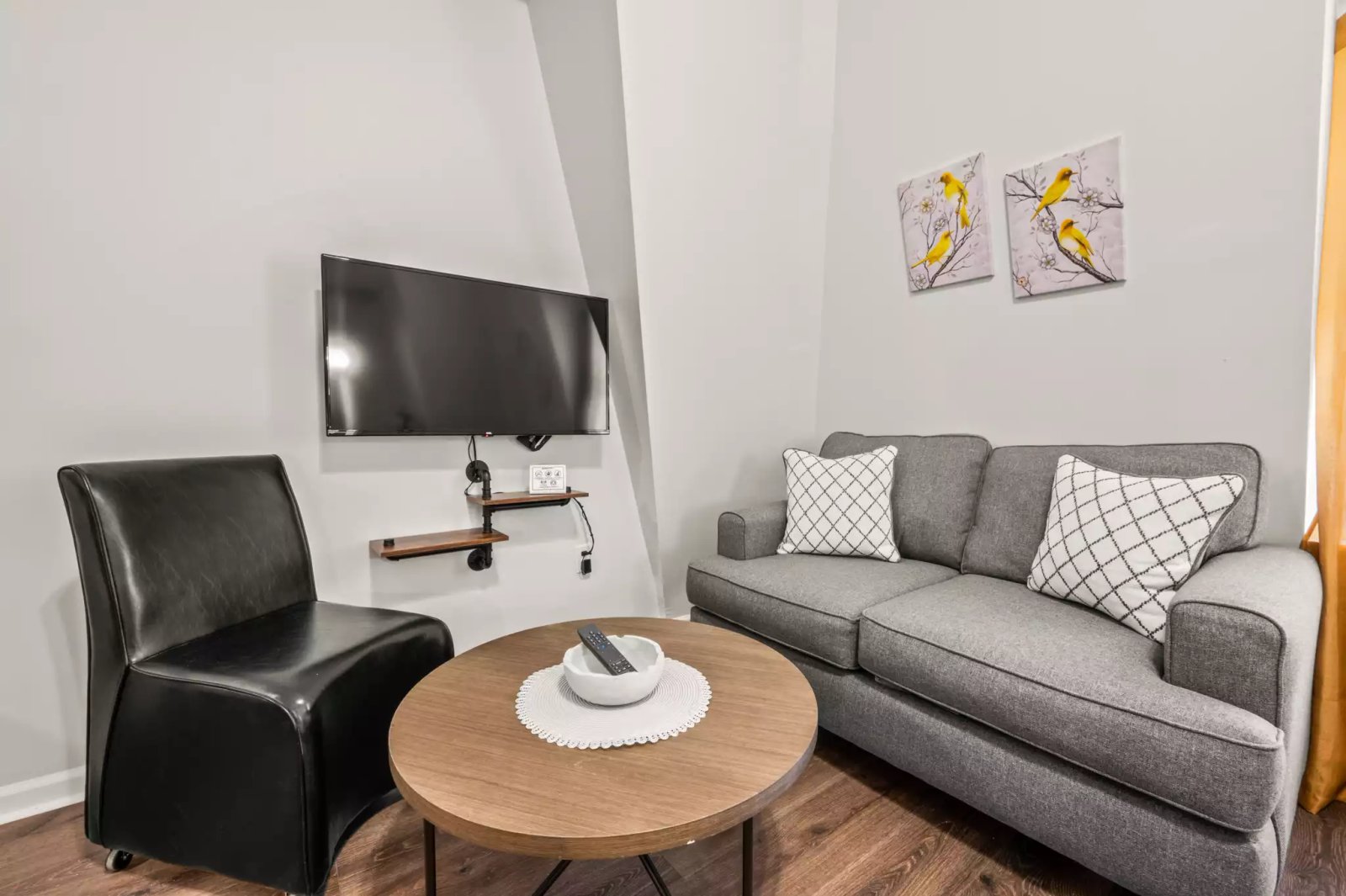 A fully furnished 1-bedroom apartment showcasing modern design and comfort. This tastefully decorated unit features a well-equipped kitchen, a cozy bedroom, and a comfortable living area, creating a welcoming and functional living space. Ideal for individuals or couples seeking a hassle-free move-in experience with all the comforts of home.