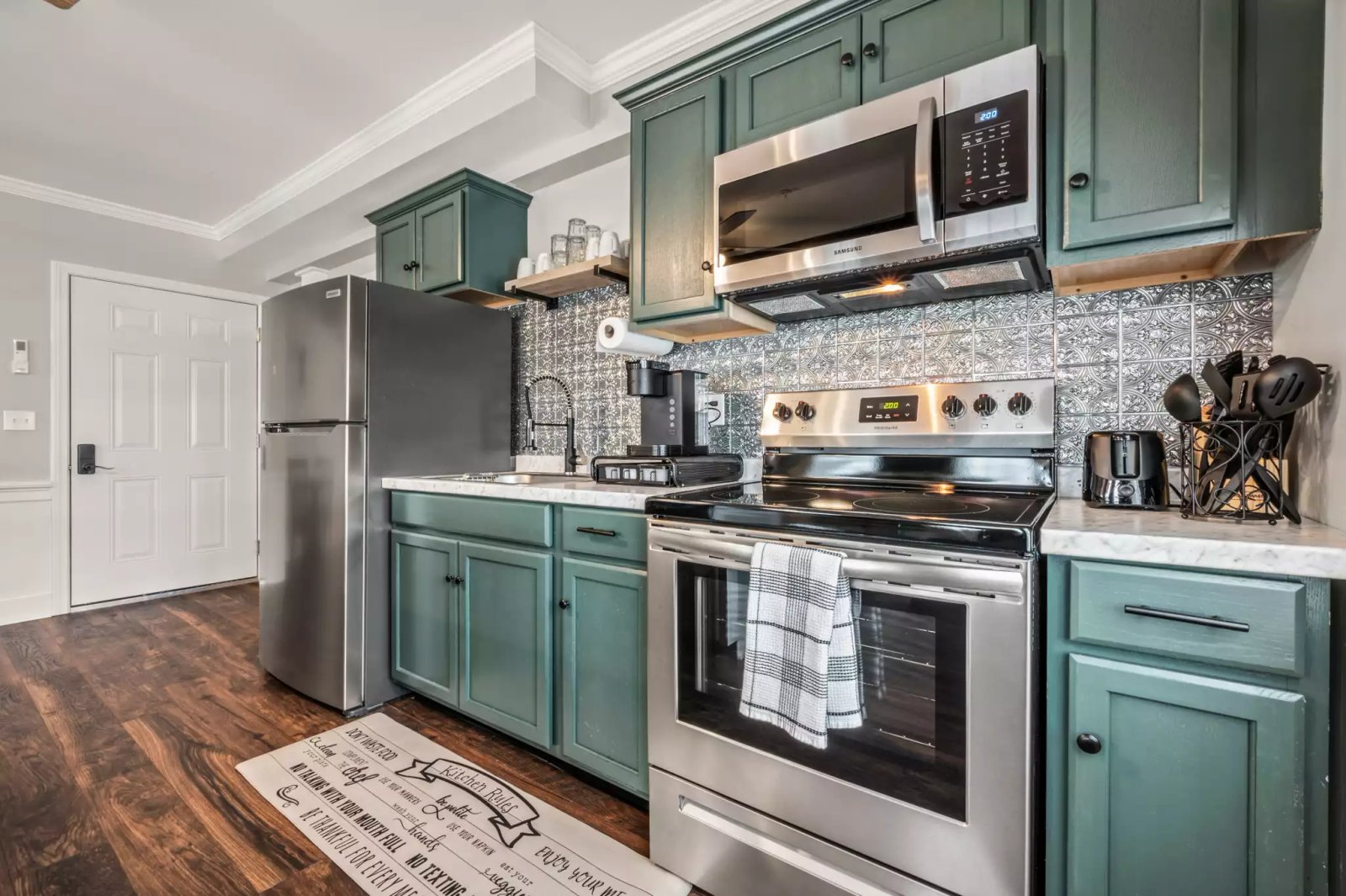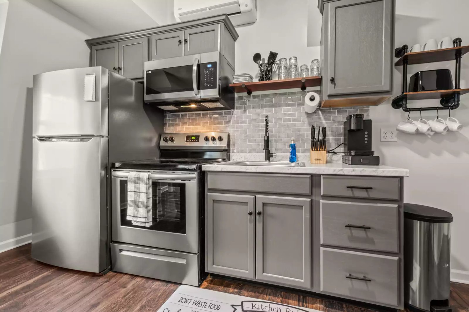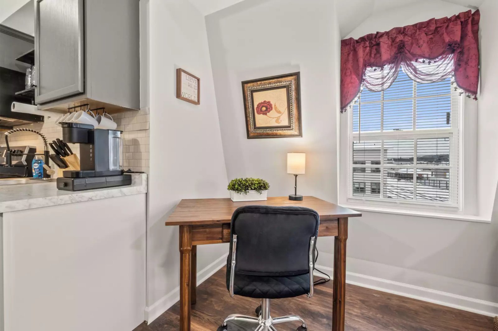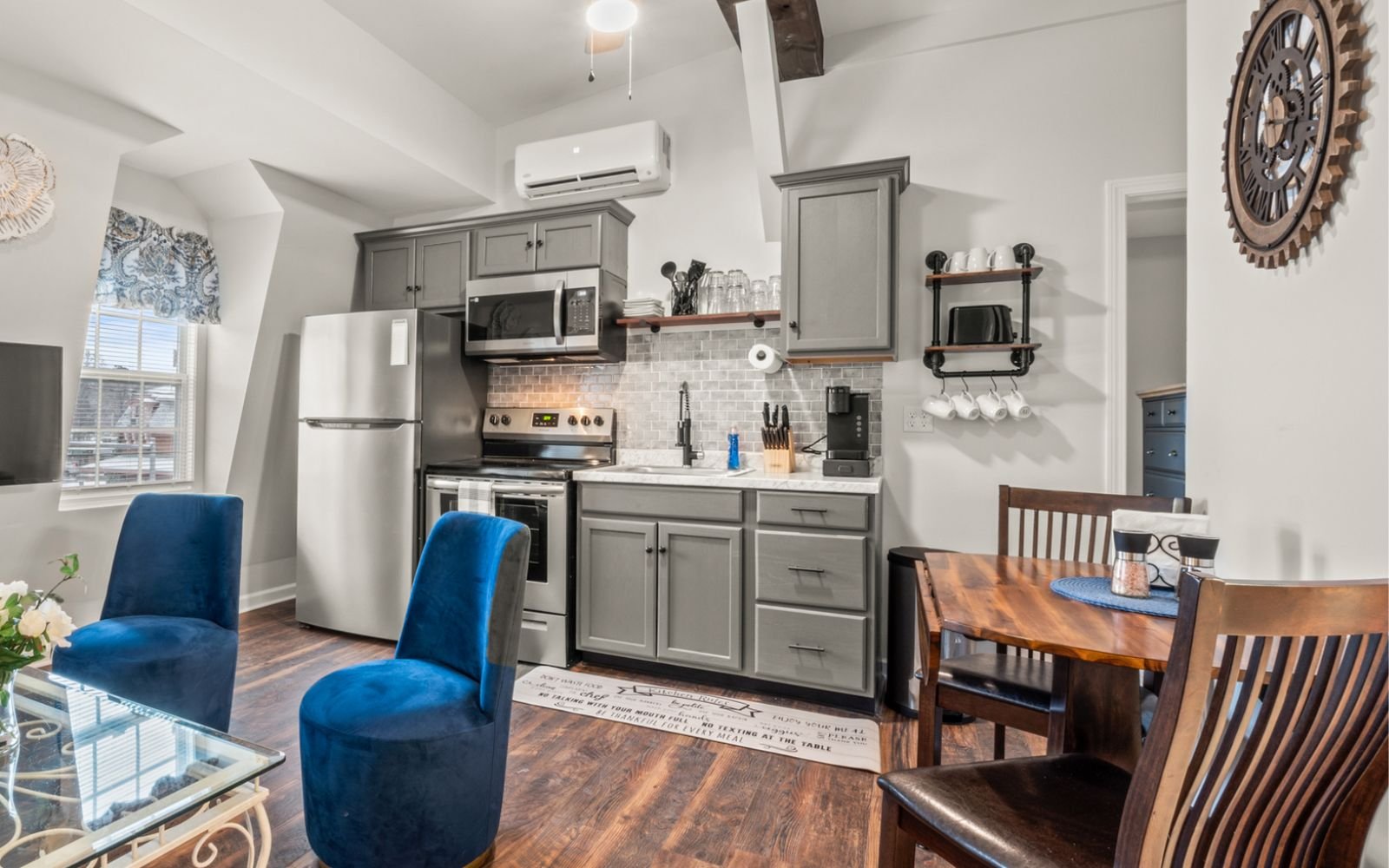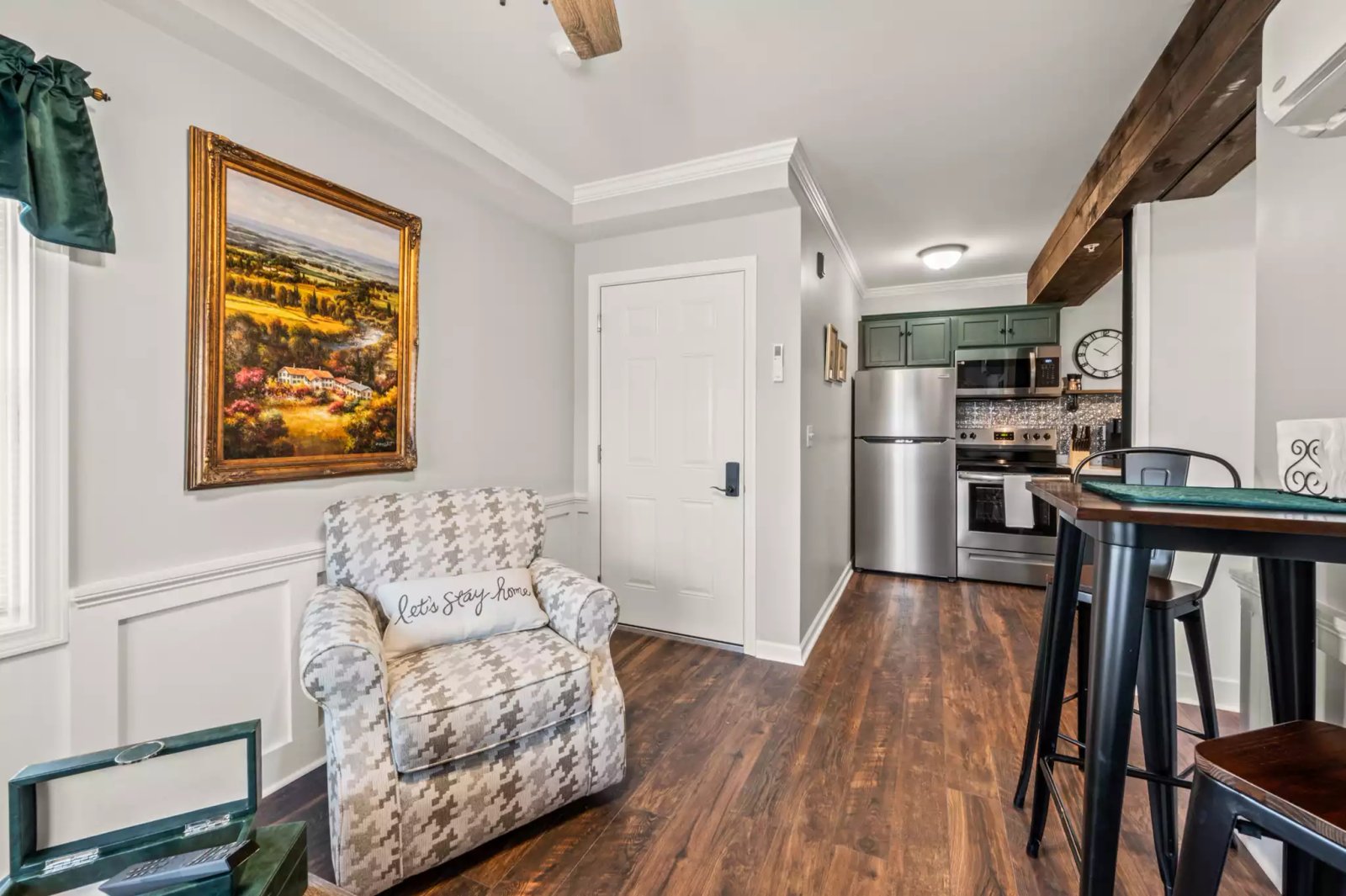 A fully furnished studio apartment nestled in the bustling center of town, conveniently located near train tracks. This compact yet stylish unit boasts modern amenities, a full size kitchen, and a comfortable living/sleeping area. Its prime location provides easy access to local shops, eateries, and public transportation, making it perfect for those who value urban convenience. Please note that occasional train noise may be audible due to its proximity to the tracks.