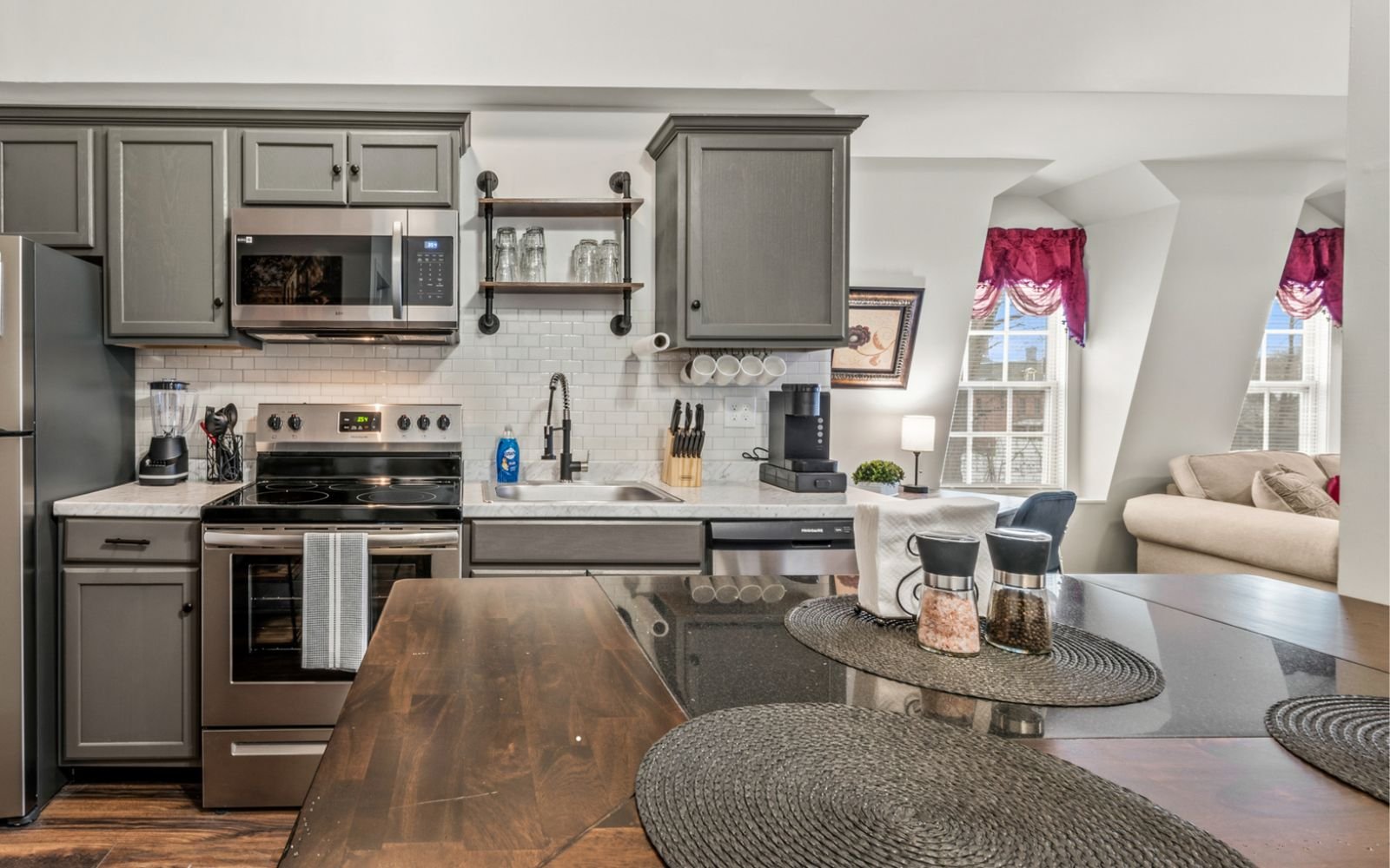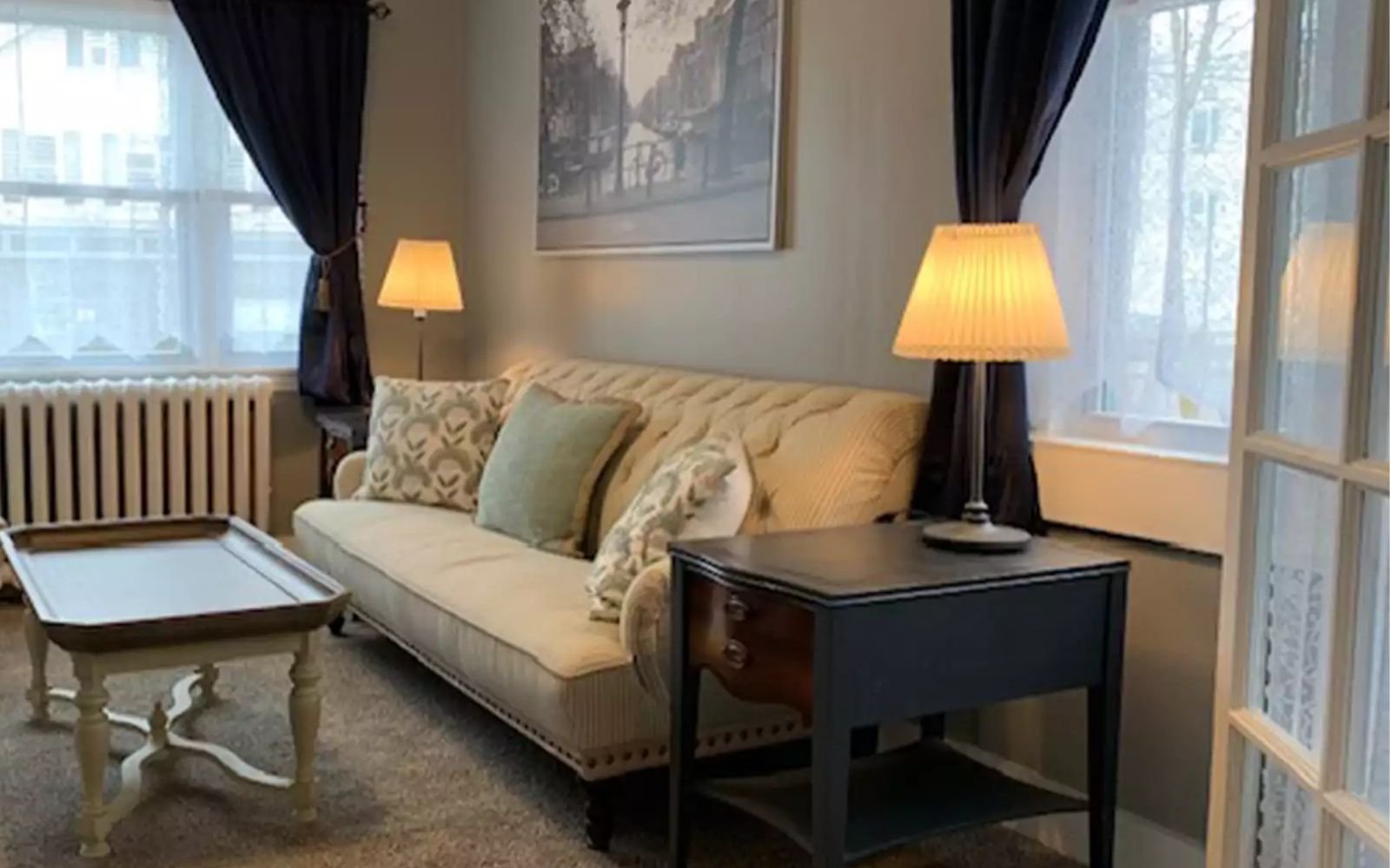 A fully furnished 1-bedroom apartment on the 3rd floor, centrally located in town and situated near train tracks. This tastefully decorated unit offers a spacious living area, a well-equipped kitchen, and a cozy bedroom. Its prime location provides convenient access to local amenities, dining options, and public transportation. Please note that due to its proximity to the train tracks, occasional train noise may be heard.