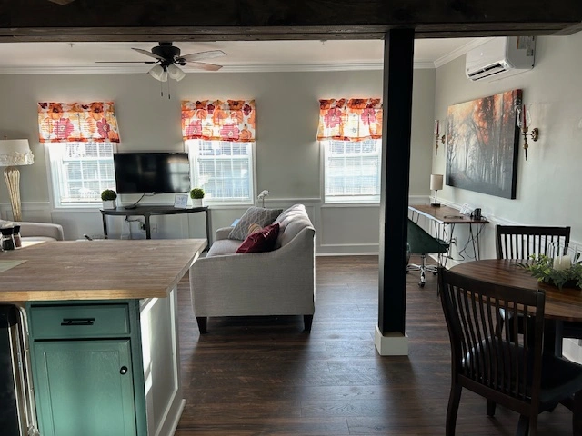 DescriptionA fully furnished 1-bedroom apartment situated on the 2nd floor in the vibrant center of town, conveniently located near train tracks. This charming unit offers contemporary furnishings, a spacious living area, a well-appointed kitchen, and a cozy bedroom.